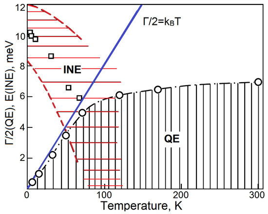 (from [16]) The temperature dependence of the quasielastic linewidth (circles) and the energy of the inelastic line (squares) are shown [16]. The width of the inelastic line in the TmSe neutron spectrum is indicated by a hatched band, bounded by dashed curves.