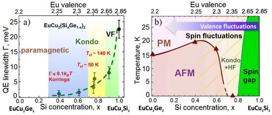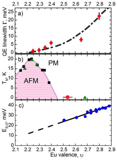 Figure 10a shows the relationship between the valence and the width of the quasielastic magnetic neutron scattering peak (), which corresponds to the energy of the spin fluctuations. When the valence exceeds = 2.55, a broad quasielastic signal with a width of about 2 meV ( 2 meV) appears in the neutron spectra [17]. Remarkably, this signal persists even at very low temperatures (T ∼ 5 K) with a width (i.e., energy of the spin fluctuations) well above kT (∼0.5 meV). At this point, the long-range magnetic order is already suppressed, as seen in Figure 10b, indicating the prominent influence of the hybridisation interaction on the electronic subsystem, starting from this particular value of the europium valence.