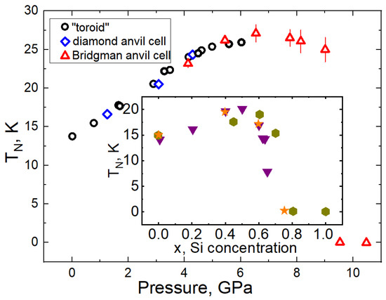 The dependence of T on pressure according to the results of all the above experiments is shown in Figure 9. The dependence of T on pressure obtained in [22] qualitatively and quantitatively (by the value of T) reproduces the dependence of T on the concentration of Si shown in the inset in Figure 9. The monotonic increase in the ordering temperature with pressure turns into a sharp decrease; there is no magnetic ordering at P > 9.5 GPa, similar to Si concentrations above x = 0.65. Note that these results are in good agreement with recent studies on the effect of pressure on T in EuCu(SiGe) systems (x = 0.5 [66,67], x = 0.45, 0.6 [21]). Their observations show that an increase in Si concentration leads to a decrease in the critical pressure required to transfer the system to a paramagnetic state. The consistency of the dependence of T on both x and P confirms that a homogeneous intermediate-valence regime is achieved in the EuCu(Si,Ge) system, similar to EuCuGe under pressure. This confirms the coexistence of intermediate valence and LRMO for the rare-earth sublattice as well. The valence appears as a universal parameter characterising the microscopic state of the system, which makes it possible to relate the effects of pressure and Si substitution on the Eu 1-2-2 system physical properties.