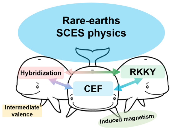 Diagram of the fundamental interactions characteristic of localised RE magnetic moments in solids. The arrows indicate their possible combinations.The CEF effects are inherent in all compounds of rare-earth elements; RKKY—exchange interaction between rare-earth ions, as well as hybridisation between localised f- and band electrons, are characteristic of metallic systems.