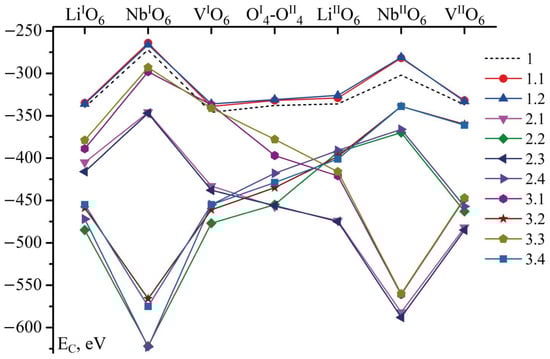 Despite the symmetry of defect positioning in oxygen layers I and II for each crystal and each defect type (Cluster 2.1 has a NbLi defect in layer I, Cluster 2.2–in layer II, all other configuration is the same, both clusters refer to one crystal LN:B(1)), the most energetically favorable boron positions are not symmetric in similar clusters. Thus, Coulomb energy is sensitive to the mutual location of defects along the polar axis. This is true, at least, in LN clusters as small as those used in our study.
