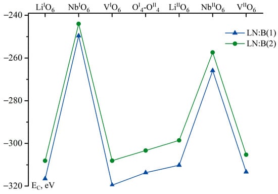 C(3.1) = 19 eV. Clusters with lower energies (2.2 and 3.1) belong to LN:B(1) crystal. Hence, homogeneous doping forms a certain mutual arrangement of the structural units of the cationic and anionic sublattices of the LN crystal. With this arrangement, the minimal interaction of the Coulomb energy of trace amounts of boron cations with the crystal structure is deeper in LN:B(1) than in LN:B(2).