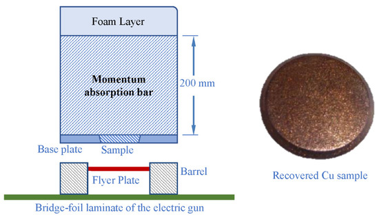 Schematic view of the experimental setup of the electric gun for the shock loading of the Cu sample and a recovered sample after the shock pressure of 49 GPa [25]. The base plate, the specimen and the momentum-absorption bar are all made of OFHC Cu.