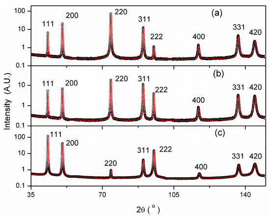 X-ray diffraction measurements were carried out in a high-resolution double crystal diffractometer, which was customized for line profile analysis [9]. The diffractometer equipped with a fine-focus rotating copper anode (RA-MultiMax9, Rigaku, Tokyo, Japan) was operated at 40 kV and 100 mA. In order to subtract Kα2 component from the Cu Kα beam, a design of a plane Ge (220) primary monochromator combined with a 160 mm wide slit was applied. In the diffraction geometry of a parallel beam, the beam size on the sample surface was about 0.2 mm × 1.5 mm. The diffraction intensities scattered from the specimen were collected by curve imaging plates (IPs). The linear spatial resolution of the IPs was 50 μm. The IPs were located at an arc of 300 mm far from the specimen, so that scattering angular range 2θ = 30° to 150° could be covered at one time. The X-ray diffraction measurements were performed in the center region of the deformed samples. All the specimens were mechanically polished and then chemically etched to remove surface damages before the X-ray diffraction measurements. The intensity distributions along the Debye–Scherrer arcs on the IPs were integrated to obtain the one-dimensional diffraction pattern as a function of 2θ. The typical diffraction patterns of the quasi-static, Hopkinson bar and electric gun compressed Cu specimens are shown in Figure 3a–c, respectively.