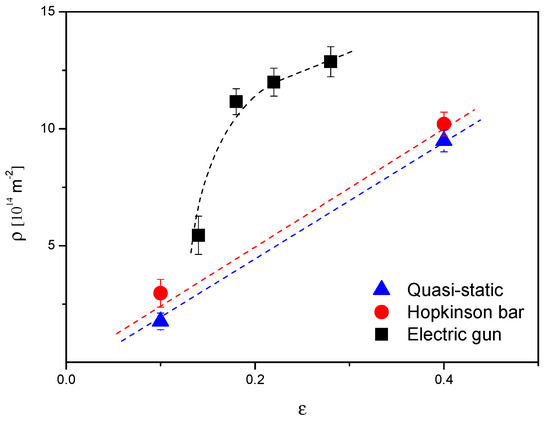 Dislocation densities in the Cu specimens after the quasi-static (blue triangles), Hopkinson bar (red circles) and electric gun (black squares) tests. The dashed lines only guide the eyes.