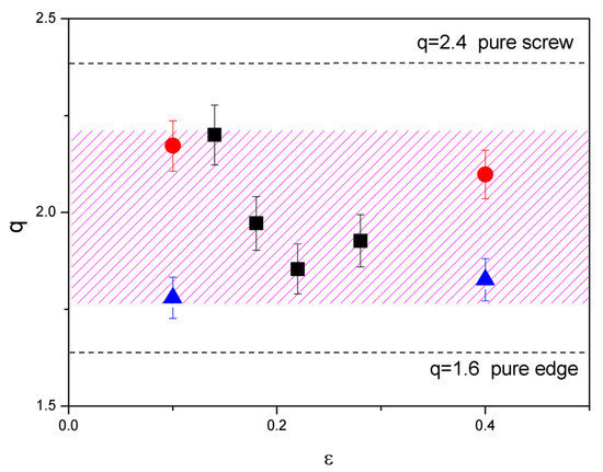 As for fcc Cu, the slip system of dislocations is a/2<111>{110}. The Zener constant, , of Cu is 3.2 [22], which is larger than unity. Strong strain anisotropy will be presented in peak broadening of the deformed Cu with huge amounts of dislocation. For the average contrast factor , the q parameter in Equation (3) can be provided directly from the evaluation of CMWP. To obtain slip activity of dislocations, the theoretical q values were calculated using numerical calculations [22,32,33] as 1.64 and 2.38 for the edge and screw dislocations, respectively. By comparing the theoretical and experimental values of q, the dislocation character, i.e., the fraction of edge or screw type, can be determined. Figure 5 shows the experimental q values of the deformed samples, which are spreading in the range of 2.0 ± 0.2. The q value equal to ~2.0 means the edge and screw types of dislocations have nearly half each. The q values in the quasi-static deformation are smaller than that in the Hopkinson bar deformation, while the most of q values in the electric gun shock loading are intermediate, i.e., between the other two modes. The evolution trend of dislocation character for all the samples is not conclusive due to a lack of adequate experimental data. However, the obtained q values indicate unambiguously that the dislocations in the recovered samples are comprised of both the edge and screw types. In principle, the cross-slip of screw dislocations promotes the formation of dislocation cells, as observed in all the deformed samples. The results are in good correlation with the dislocation morphology observed in the Cu specimens [4,5,14].