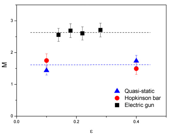The arrangement parameter of dislocations, M, of the Cu specimens after the quasi-static (blue triangles), Hopkinson bar (red circles) and electric gun (black squares) tests. The dashed lines only guide the eyes.