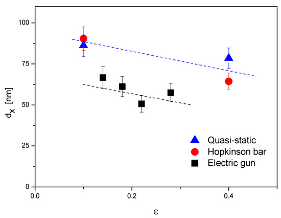 The subgrain size dx in the Cu specimens after the quasi-static (blue triangles), Hopkinson bar (red circles) and electric gun (black squares) tests. The dashed lines only guide the eyes.