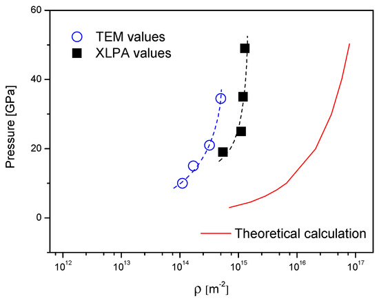 where , and are the initial and shocked lattice parameters, respectively. According to the Rankine–Hugoniot equation and the equation of state, the shocked lattice parameter and also the dislocation densities were obtained as a function of shock pressure [4,16]. Figure 9 shows the calculated and the TEM [41] measured values of dislocation density at different pressures for polycrystalline copper. There is a significant difference between the results obtained from the homogeneous dislocation nucleation model and the TEM observation, where the former is at least one or two orders of magnitude larger than the latter. The copper data are not a unique case; similar phenomena were also found for other metals such as Ni [16] and Ta [17].