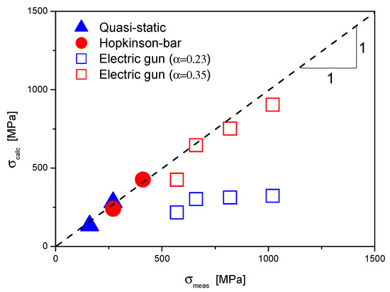 The calculated, σcalc, vs. the measured, σmeas, flow-stress values for the quasi-static (blue triangles), Hopkinson bar (red circles) and electric gun (blue open squares for α = 0.23, red open squares for α = 0.35) deformed samples.
