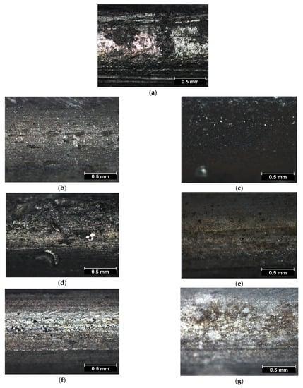 Typical surface images of aluminum and steel wire samples obtained by OM are shown in Figure 1 and in Figure S1 of Supplementary Materials.