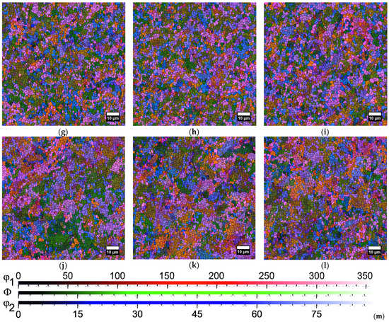 On EBSD maps (Figure 2 and Figure S3 of Supplementary Materials), the grain boundaries are shown as solid black lines. As grains, the regions were considered in which the crystal lattice is misoriented by an angle less than 2°, the orientation of each grain being described by three Euler angles φ1 (angle of intrinsic rotation), Φ (angle of nutation), and φ2 (angle of precession) [54]. The orientation of each grain (i.e., the orientation of the grain crystal lattice) is displayed with its own color of a certain contrast by means of marking each of the angles with its own color and assigning each possible value of the angles to its own degree of contrast (see legend in Figure 2m). Accordingly, grains of close orientation have colors of the same gamut of close shades. Thus, if there is a tendency for preferential orientation of grains, clusters of grains of close shades of the same color are observed on EBSD maps. If there is no preferential orientation, then EBSD maps will have a colorful appearance.