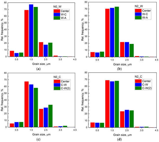 Grain size (Dgrain) distribution histograms in the central and edge areas of the cross-sections of (a) aluminum wires N0_W (from AC50 cable of service life of 0 years (new)) and (b) N2_W (from AC50 cable operated 52 years in an OPL, 1/4 span) and (c) steel wire cores N0_C (new) and (d) N2_C (service life of 52 years, 1/4 span). The aluminum sample is designed as ‘_W’, whereas the steel wires are shown with ‘_C’ designation. Histograms designated as ‘Center’ were obtained from the centers of the wire cross-sections. Histograms designated as W-C and W-A were obtained from areas of aluminum wires near contacts of aluminum wire—steel wire core and aluminum wire—air/atmosphere, respectively. Histograms designated as C-W and C-W(2) were calculated from areas of steel wire cores near contacts of steel wire—adjacent aluminum wire and steel wire—adjacent aluminum wire at opposite side of the steel wire. For better visualization, the Center and W-A (or W-C(2)) histogram columns are shifted along the abscissa axis by the width of the base of the histogram columns, respectively, to the left and right relative to the true position.