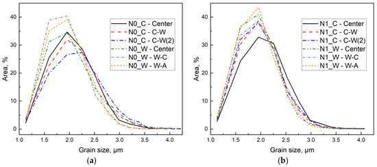 Relative areas Srel occupied by grains with dependence on the grain sizes Dgrain in (a) new sample N0 and sample (b) N1 (0/1 span) after 52 years of operation in an OPL. For designations, see caption of Figure 3.
