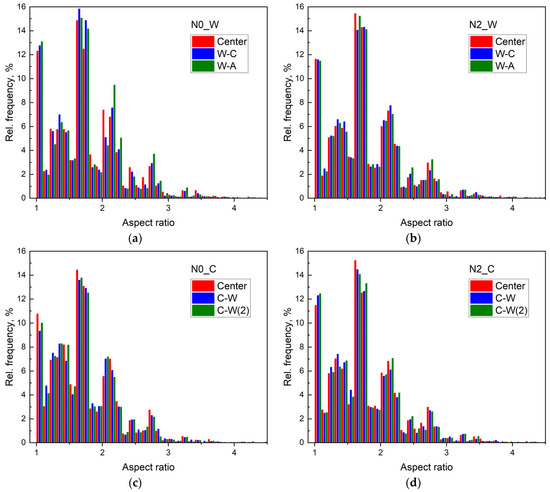 AR distribution histograms in the central and edge areas of the cross-sections of (a) aluminum wires N0_W (from AC50 cable of service life of 0 years (new)) and (b) N2_W (from AC50 cable operated 52 years in an OPL, 1/4 span) and (c) steel wire cores N0_C (new) and (d) N2_C (service life of 52 years, 1/4 span). For designations, see the caption of Figure 3. For better visualization, the Center and W-A (or W-C(2)) histogram columns are shifted along the abscissa axis by the width of the base of the histogram columns, respectively, to the left and to the right relative to the true position.