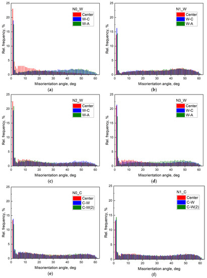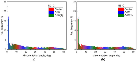 Below, a brief description of the results of the qualitative inspection of the grain size distribution histograms (Figure S4a–d of Supplementary Materials and Figure 3a–d), dependences of relative area Srel occupied by grains on their size Dgrain (Figure 4 and Figure S5 of Supplementary Materials), grain distribution histograms according to their AR (Figure 5 and Figure S6 of Supplementary Materials), and histograms of grain distribution by misorientation angle φmis by the misorientation angle φmis of GBs (Figure 6) are given. An additional detailed description of the histograms and dependences obtained from the analysis of the EBSD maps is presented in Section S2.3 of Supplementary Materials.