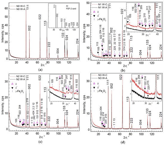 EBSD, EDX, and XRD were registered from different sides of the wires, which had been in contact with the surrounding atmosphere or the steel core in the case of Al wires or the adjacent Al wire in the case of steel wires. These different contacts are indicated in the text, tables, and figures either directly by words or by the corresponding letters (A (air/atmosphere), W (Al Wire), and C (steel Core)), which are attached to the designation of the sample. For example, N1_W-A stands for “sample taken at 0/1 span position, Al Wire, side in contact with Air”, or N2_W-C stands for “sample taken at 1/4 span position, Al W, side in contact with steel Core”, etc. For ease of use, the nomenclature of samples is summarized in Table S2 of Supplementary Materials.