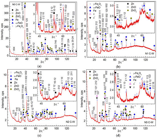 For Al wires, the characteristics obtained with XRD are averaged over NSL with thickness Tpen ≈ 36 μm. In the case of steel wires, if they are new, the depth from which the X-ray signal comes is determined by the galvanic Zn layer with Tpen ≈11 μm and up to ≈19 μm if it is oxidized. If the reflections of Fe and FeO and Fe2O3 oxides are visible, then this means that the galvanic layer is disturbed (or destroyed) and the depths from which XRD reflections occur are much smaller: Tpen ≈1.9 μm in the case of only Fe material and up to Tpen ≈ 3.2–4.5 µm for iron oxides.