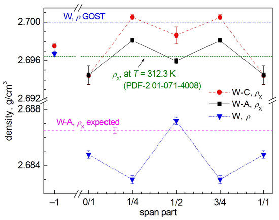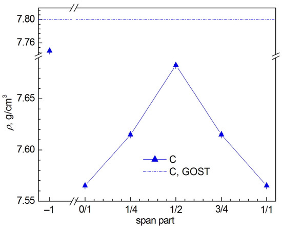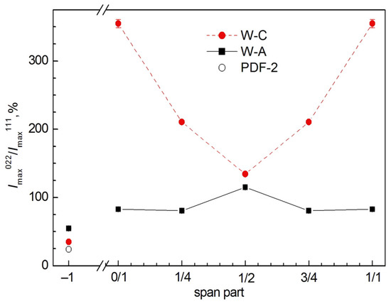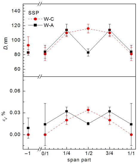 It is worth noting that if similar dependences on the span part are constructed for other quantitative microstructure parameters obtained from the EBSD analysis and summarized in Table S4 of Supplementary Materials, then these dependences have a character similar to the dependences of the average grain size <Dgrain> on the span part. The only difference is that the change in some parameters is in antiphase with <Dgrain> when moving along the span, i.e., their values decrease when <Dgrain> increases, whereas the change in other parameters is in phase with the change in <Dgrain> (cf. Figure 7a–l and Figure S7a–h of Supplementary Materials. For ease of comparison, the dependences of the microstructure parameters of the same type for aluminum and steel wires are shown in the figures on the same scale).