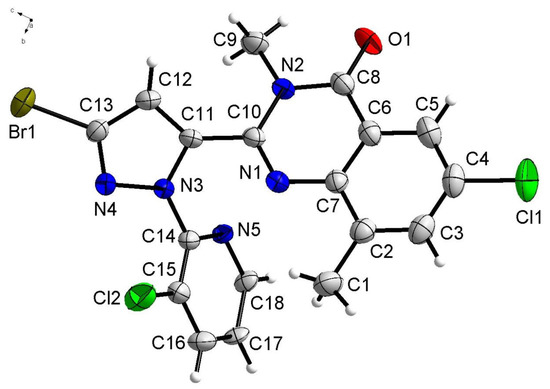 Compound 2b: White solid, yield 84.52%, m.p. 183.2~183.7 °C. FT-IR v (cm−1): 3126, 3080, 3049, 2967, 1681, 1593, 1525, 1463, 793. 1H NMR (400 MHz, CDCl3) δ 8.26 (d, J = 2.29 Hz, 1H), 8.15 (d, J = 2.44 Hz, 1H), 7.88 (d, J = 2.29 Hz, 1H, pyr-H), 7.69 (d, J = 2.44 Hz, 1H), 6.87 (s, 1H), 3.77 (s, 3H, N-CH3). 13C NMR (101 MHz, CDCl3) δ 160.6, 146.6, 145.6 (d, J = 6.97 Hz), 141.8, 139.0, 137.9, 134.9, 133.5, 133.1, 132.7, 128.5, 128.4, 125.1, 122.5, 112.6, 33.9. HRMS calculated for C17H8BrCl4N5O [M+H]+ 519.8715, found 519.8705.