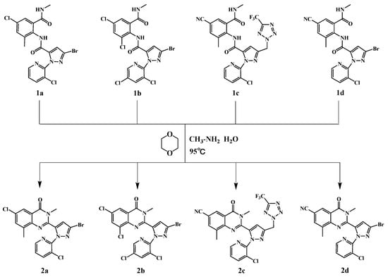 The reaction substances (compound 1a, 10 g, 20 mmol), 1,4-dioxane (40 mL), and approximately 1% of methylamine aqueous solution were sequentially added to a round -bottom flask equipped with a stirrer, with full stirring, and 400 mL of distilled water was added, and the reaction was carried out at 90 °C for 4 h. The reaction was monitored using TLC (petroleum ether/ethyl acetate = 2:1, v/v). The resulting precipitate was filtered under vacuum, washed with water, and dried in air. The crude product was purified using column chromatography (silica gel, petroleum ether/ethyl acetate = 5:1, v/v), and the product 2a was obtained. Products 2b~2d were produced with the same procedure using starting materials 1b~1d. The synthesis path is shown in Scheme 1.