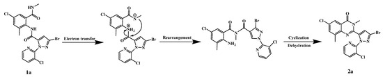 The reaction was carried out in a one-pot method at constant temperature using four compounds (1a~1d) containing bisamide structures as starting materials. The reaction uses aqueous methylamine solution as a catalyst, and the reactants undergo Smiles rearrangement [18] under alkaline conditions, then undergo intramolecular cyclization and dehydration to obtain the product. According to the conversion process of the reaction, considering reactant 1a as an example, the reaction mechanism is deduced, as shown in Scheme 2. The synthetic route has the advantages of mild reaction process, fast reaction progress, simple reaction operation, few by-products, and so on.