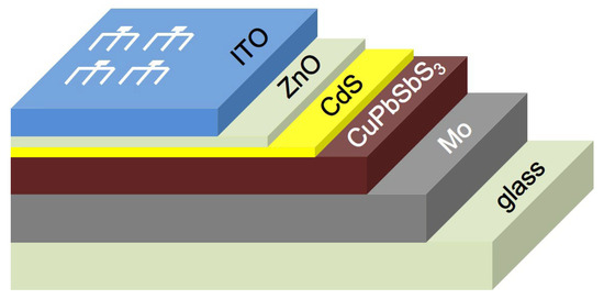 The illustrative diagram of substrate structure CuPbSbS3 thin films solar cells can be seen in Figure 1. Firstly, Mo thin film was deposited by direct current magnetron sputtering. To increase the adhesion of the film to the glass substrate, a double-Mo-film with a ~300 nm higher power (150 W) layer and a ~800 nm top lower power (100 W) layer was prepared.