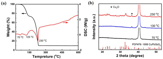 The Cu-Pb-Sb precursors are subsequently mixed at a mole ratio of Cu:Pb:Sb = 0.9:1:1. In order to explore the formation process of substances and afterwards determine the drying and annealing temperatures of the sintering procedure, TGA and DSC of Cu-Pb-Sb mixed solution was performed. Figure 2a shows the phase change process of the Cu-Pb-Sb mixed solution. The endothermic peak at 70 °C attributes to the evaporation of ethanol. A broad endothermic peak around 125 °C is associated to removal of free BDCA. At 230 °C, the Cu-Pb-Sb mixed solution has the greatest mass loss, owing to the fact that the BDCA solution begins to dissociate the metal sulfides and starts the reaction to form CuPbSbS3. In order to confirm this hypothesis, XRD tests were conducted on the as-spin coating film annealing at different temperatures. As shown in Figure 2b, the film shows amorphous properties after annealing at 70 °C, in which the diffraction peak at 36.41° belongs to Cu2O preferentially precipitated in solution. Due to the small charge and coordination number of Cu+, its polarization ability is weak, and the coordination bond strength of the coordination compound formed with BDCA solution is also low. Therefore, the precipitation of Cu2O was observed at 70 °C. The phenomenon of producing a p-type light-absorbing material of copper oxide in the film, which maybe helps to promote the absorption of sunlight, and is also easy to form a copper poor CuPbSbS3 thin film benefit to improve the device efficiency similar in copper based solar cells, such as Cu(In,Ga)(S,Se)2 and CZTS. Above situation is consistent with the purpose of the proportion of copper poor elements used in the design of the experiment. The XRD pattern of the sample annealing at 130 °C is consistent with that of 70 °C, which indicates that CuPbSbS3 cannot be generated in the sample below 125 °C. However, when the temperature was increased to 230 °C, the sample showed obvious multiple diffraction peaks, which belonged to CuPbSbS3 phase (PDF#76-1999). The Cu-Pb-Sb mixed sulfides dissociates and stable CuPbSbS3 phase is formed around 230 °C. Based on the above XRD and TG analysis, we can obtain a more suitable preparation process, and set the drying and annealing temperatures of the final film preparation to 70 °C and 275 °C accordingly.