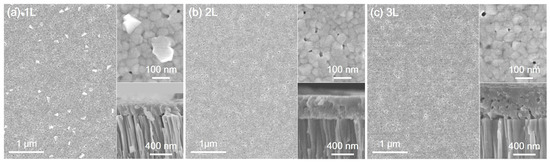 Surface and cross-section SEM images of (a) 1 layer (1L), (b) 2 layers (2L) and (c) 3 layers (3L) CuPbSbS3 films.