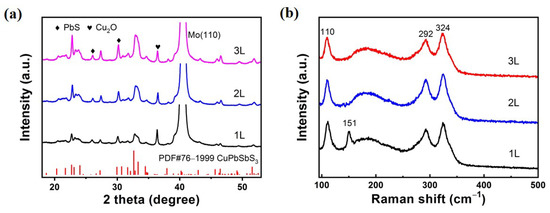 To further verify the above results, we conduct Raman tests and show them in Figure 4b. Raman spectra show that the 1L film annealed at 270 °C has obvious Raman peaks of CuPbSbS3 phase (110 cm−1, 292 cm−1 and 342 cm−1), which is consistent with the literature [12]. A 151 cm−1 peak referred to the Sb2S3 phase only appears on 1L film rather than 2L and 3L films, which verifies again the existence of Sb2S3 on 1L film except other samples [13]. These results are in agreement with those of SEM and XRD.