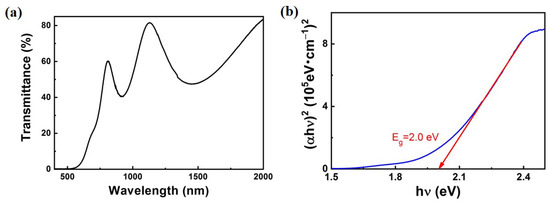 In order to explore the potential of CuPbSbS3 films as absorption materials, we tested the transmission spectrum and calculated absorption coefficient of a 3L-CuPbSbS3 film on glass, as shown in Figure 5. The absorption coefficient of CuPbSbS3 film can reach up to 105 cm−1, which fully proves its potential as an absorption material for solar cells. The calculated band gap of CuPbSbS3 is 2.0 eV which is different from its theoretical direct band gap of 1.41 eV [14]. In fact, due to differences in preparation methods, the actual band gap value reported now will be slightly different. For example, Richard L. Brutchey’s team prepared CuPbSbS3 with a band gap of 1.21 eV in 2020 [15]. In the same year, the band gap of CuPbSbS3 prepared by J. Tang’s team is 1.31 eV [6]. David J. Lewis’s group prepared CuPbSbS3 powder with a band gap of 1.55 eV in 2021 [12]. In the process of preparing CuPbSbS3, secondary phases such as Cu2O (2.2–2.48 eV), PbS (0.76–1.91 eV) and Sb2S3 (1.7–1.8 eV) are easily generated, and the formation of these secondary phases will have a certain impact on the final band gap of the film [16,17,18,19,20]. The wide band gap value of 2.0 eV indicates that CuPbSbS3 can be applied to the laminated top solar cell material, which helps to improve the light absorption of the laminated solar cell in the short wavelength segment. So, we prepare CuPbSbS3 films with repeating the spin coating/sintering process three times, and assemble them into Glass/Mo/CuPbSbS3/CdS/ZnO/ITO structure of the solar cell to probe into its development potential in laminated top solar cells.