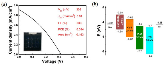 (a) J-V and (b) band scheme of CuPbSbS3 thin film solar cell.