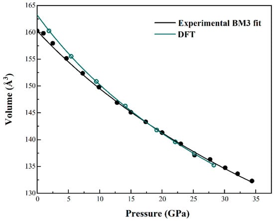 To verify the XRD experimental results, we then carried out the theoretical calculation using Density Functional Theory. Energy–volume results were also fitted with the BM3-EoS [31,32], which yields VT0 = 163.2(1) Å3, KT0 = 102(1) GPa, and KT0′ = 4.2(2). The bulk modulus from the DFT calculation was slightly smaller than the experimental results (Figure 3). The calculated equilibrium volumes were generally underestimated by 3% in comparison to the experimental results, which is typical for PBE method computations. Our fitted values are comparable with those reported typical values of phosphates [33].