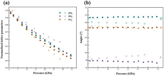 The trend of lattice parameters relative to a (a/a0), b (b/b0), c (c/c0), α, β, and γ angles with pressure are plotted in Figure 3. To determine the axial compressibility of each axis in amblygonite, we used a linearized BM3 fitting where each axial dimension is cubed and treated as a volume in the BM formulation [30]. The zero-pressure axial compressibility of linear dimension l, defined as βl0 = −(l−1)(δl/δP)P=0, is related to the linear modulus (linear incompressibility) by Kl0 = (βl0)−1. For amblygonite, our fitted linear moduli to a, b, and c were 387(7), 430(5), and 359(9) GPa, respectively, corresponding to axial compressibility values of βa = 2.58(1) × 10−3, βb = 2.33(2) × 10−3, and βc = 2.79(3) × 10−3 GPa−1. There is a considerable anisotropy in axial compressibility with βc > βa > βb and the ratio of zero-pressure axial compressibility in amblygonite is 1.11:1.00:1.20. The DFT calculated results are more scattering than the experimental data (experimental results: solid symbols, DFT: open circle), but both results are in agreement with each. The interaxial angles α, β, and γ showed a steady trend in compression up to ~35 GPa, supported by the experimental and calculation evidence (Figure 4).