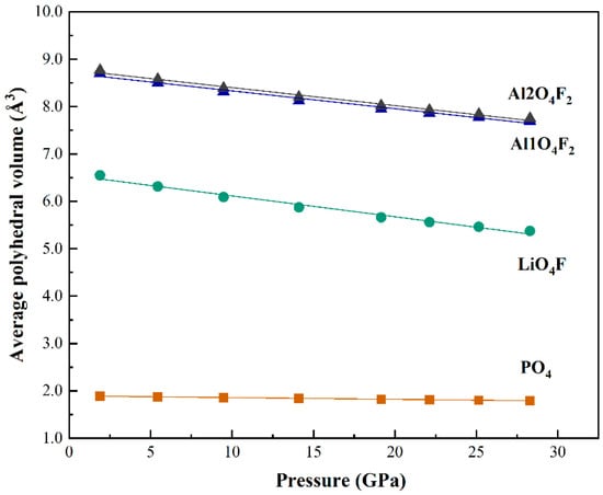 Among these three types of polyhedra, PO4 tetrahedra showed little or no compression, while LiO4F polyhedra showed the greatest compression (Figure 5). The average AlO4F2 volume was 9.125 Å3 at 1.9 GPa and decreased to 7.725 Å3 at 28.3 GPa, and the average volume in LiO4F polyhedra was about 7.072 Å3 at 1.9 GPa and changed to 5.377 Å3 at the highest pressure. Between 1.9 and 28.3 GPa, the PO4 tetrahedra showed the least compression, decreasing from 1.919 to 1.793 Å3 in the amblygonite sample. Slopes of the polyhedral volumes as a function of pressure were obtained from a linear fit. It can be concluded that the distorted trigonal prismatic geometry of the LiO4F unit is more compressible than the PO4 rigid polyhedral unit. On the other hand, the partial replacement of Li by Na might decrease Li-O bond strength, thus making the LiO4F polyhedra softer. The OH-F substitution is also giving rise to the less rigid LiO4F and AlO4F2 polyhedra. Therefore, the unit–cell volume decrease on compression is dominated by the compression of the AlO4F2 octahedra and LiO4F polyhedra.