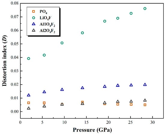 Bond lengths, angles, and polyhedral volumes are useful parameters to characterize the distortion of each polyhedron. The compressibilities calculated based on theoretical (DFT) results of three polyhedra (AlO4F2, PO4, and LiO4F) are significant. There were two distinct octahedral sites (Al1 and Al2), two distorted hexahedral sites (Li1 and Li2), and two P positions (P1 and P2) (Table S2). Bond length (Å), polyhedral volume (Å3), distortion index (D), and quadratic (λ) and bond angle variance (σ2) for various polyhedra at different pressures are shown in Table S2.
