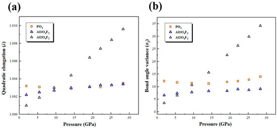 The pressure dependence of the quadratic elongation (λ) (a) and bond angle variance (σ2) (b) in amblygonite, respectively.