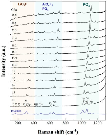 To date, there is no detailed high-pressure Raman spectroscopic study on amblygonite. Figure 8 shows in situ Raman spectra of LiAlPO4F recorded from ~100 to 1300 cm−1 at various pressures up to 28.6 GPa. All observed Raman peaks shifted to a higher frequency with increasing pressure. In the 1000–1150 cm−1 region, there were prominent peaks located at 1019, 1053, 1066, and 1116 cm−1 that can be assigned to various P–O stretching modes [36]. The spectra were more complex below 650 cm−1, and the mixed region composed of P–O bending and AlO4F2 stretching vibrations mainly contributed to the absorption in this domain [37]; therefore, some vibration modes merged together with increasing pressure. The intense band at 486 cm−1 is attributed to the symmetric Al–O–Al stretching mode in the network. Some Raman modes located between 400–650 cm−1 may be assigned to the O–P–O deformation modes, which are in accordance with the results from Cooper et al. [38]. Lower frequencies from 140 to 330 cm−1 can be attributed to the O–Li–O (or F) bending and Li–O bond vibrations. which are in agreement with the spectroscopic study of lithium pyroxenes [39,40]. This shows that modes v1, v2, and v3 spread out non-monotonically with increasing pressure and it might be caused by the asymmetric stretching and bending of O–Li–O and O–Li–F bonds (Figure 8). It should be noted that there were no obvious peaks broadening observed for all spectra, indicating that the structural disorder over the lattice sites was insignificant up to the highest pressure.