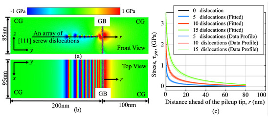 The dislocation pileup-induced internal stress (): (a,b) front and top views of the shear stress contour when 15 dislocations were piled up at the GB; (c) the stress profiles ahead of the tip of a pileup containing 5−15 dislocations, fit into Equation 1.
