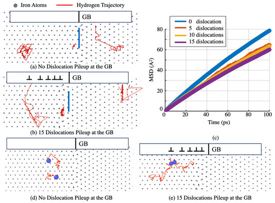 Figure 3c shows the MSD curves resulting from such calculations within a duration of 100 ps. Note that, when a particle (here, a H atom) is in diffusive motion, its MSD is linearly proportional to the diffusion coefficient. Using the MSD curves in Figure 3c, we measured the local H diffusion coefficient as the slope of each MSD curve. The extracted H diffusion coefficients are summarized below. Clearly, the more dislocations piled up at the GB, the higher the stress intensity and the lower the H diffusion ahead of the pileup tip. In detail, the shear stress at 3 GPa ahead of the pileup tip seems to reduce the H diffusivity at the GB by 30%. The simulation-predicted diffusivity reduction at the pileup tip implies a new mechanism: the plasticity-induced clustering of hydrogen (PICH). A combination of this mechanism with many previously reported mechanisms might contribute to hydrogen embrittlement through four steps: (1) the H-enhanced localization of plasticity (HELP), i.e., H-promoted dislocation pileup formation (not modeled in this work but widely reported in the literature); (2) the accumulation of H at the slip–GB intersection through the PICH mechanism; (3) hydrogen-enhanced de-cohesion (HEDE) at the GB; and (4) hydrogen-induced cracking (HIC). We believe that HEDE is only possible after the process of PICH, because HEDE demands the accumulation of a large population of H in a local region at the GB. We will provide more direct evidence of this in our future publications. To confirm the occurrence of PICH, we chose several pairs of H atoms and monitored the relative distances between the two atoms in each pair. The results showed that the separation between the two H atoms in each pair decreased upon an increase in the number of dislocations in the pileup. Figure 3d,e present the typical trajectories of two H atoms in one pair near the GB when n = 0 and n = 15, respectively. It is seen that the two H atoms get significantly closer with respect to each other when n = 15 than what has been observed when n = 0.