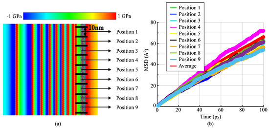 A characterization of the H diffusion and local stress heterogeneity induced by the accumulation of a large number of long dislocations at a H-charged GB in the CAC simulation: (a) the distribution of the shear stress within the slip plane near an H-charged GB when multiple 95 nm dislocations (n = 15, with each dislocation carrying a clearly visible shear stress field) were accumulated nearby; (b) the MSD of the H atoms at nine different locations on the GB along the dislocation line.