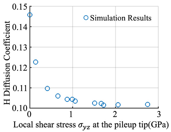 Since , , and can all be directly measured from the CAC simulations, a fitting the CAC-simulation-predicted at chosen sites (such as position 5 in Figure 4a) ahead of the tip of pileups containing different numbers of dislocations enables us to determine all the model parameters in Equation (6). A direct correlation between the pileup tip local stress () and the pileup tip H diffusion coefficient (see Figure 5) can be established. The incorporation of such information extracted from CAC simulations into higher-length-scale models, such as the continuum-level CPFE, will be tested and reported in a separate work.