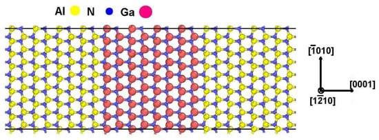 projection of the balls and sticks model of a GaN QW pseudomorphically matching AlN along the [0001] crystallographic direction. The polarity of the wurtzite structure implies different atomic arrangements at the two interfaces (illustration produced via the software package Open Visualization Tool (OVITO v.3.3.2) [] (OVITO GmbH, Darmstadt, Germany).