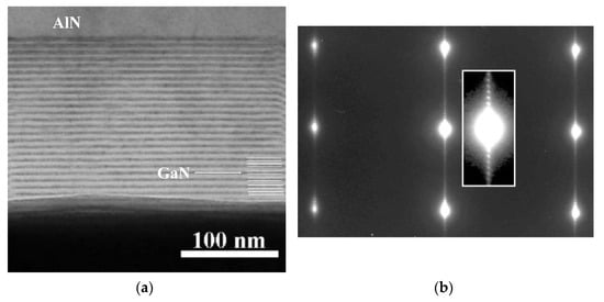- Friel, I.; Driscoll, K.; Kulenica, E.; Dutta, M.; Paiella, R.; Moustakas, T.D. Investigation of the design parameters of AlN/GaN multiple quantum wells grown by molecular beam epitaxy for intersubband absorption. J. Cryst. Growth 2005, 278, 387–392. [Google Scholar] [CrossRef]