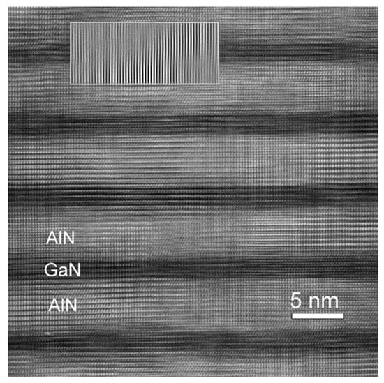 Cross-sectional HRTEM image of the AlN/GaN superlattice viewed along the [110] zone axis from a magnified area of Figure 2a. The superimposed Fourier-filtered image confirms that the QW growth is pseudomorphic.