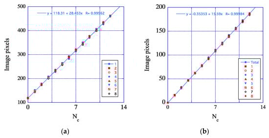 The slope of the linear least-squares fit relates to the a-lattice parameter of AlN, . This, combined with the above-found value cAlN = 28.453 pixels (Figure 4a), yields 1.58. It is considered in the following that this value represents a trustable determination of this ratio. The value is lower than that measured in the single crystal, [], indicating that due to their pseudomorphic relationship, both sample constituents are deformed. Moreover, the least-squares straight line does not pass precisely through the origin in this figure. This relates to the errors committed to measuring the distances of successive atomic columns, which affect very little of the slope of the linear fit and its average value representative of the a-lattice constant of AlN barriers in the sample. It should be stressed here that lattice constants of the superlattice are likely to evolve with changing the thicknesses of the constituents. For further progress in strain partitioning and comparing the above findings with modeling, there is a need to convert lattice constant measurements into real units, which has been conducted via the deconvolution methodology presented in the next section.