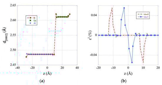 The relaxed configurations of the studied systems allow for extracting the perturbations of the interplanar distances d0002 due to the hetero-phase interfaces, information experimentally out of reach. Figure 5a is the graph of the d[0002]-spacings of metallic and nitrogen successive layers of a strain-balanced pseudomorphic GaN on AlN (m = 4, n = 8) as a function of the z-position obtained from a relaxed configuration of a superlattice analogous to the experimental sample (Figure 2). As is qualitatively visible in the figure, only a few atomic layers are perturbed by the interfaces. Local, relative changes of d-spacings are better highlighted by, and is defined by: