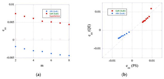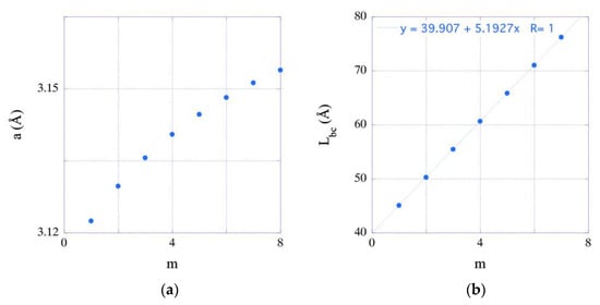 Values of the a-lattice parameter and the length, , of the relaxed bicrystal prove that the deformation states corresponding to different GaN thicknesses are different (Figure 6). As expected, the variation of is linear with m, whereas the slope of the linear least-squares fit the data yields the value of the GaN c-lattice parameter in the superlattice. This is found to be practically identical to the single crystal value, (Table A1). The intercept with the vertical axis is an estimation of the c-lattice parameter of AlN, , which is identical to the value obtained for the single crystal. This finding confirms the qualitative statement that interfacial perturbations are short-ranged and shows that the total thicknesses of the studied systems along the common c-axis are about equal to these of the equimolar mechanical mixture of the two compounds. However, by considering the precisely calculated values of Lbc, we may notice short elongations that should be attributed to the influence of interfaces. These almost negligible elongations are not visible in Figure 6b.