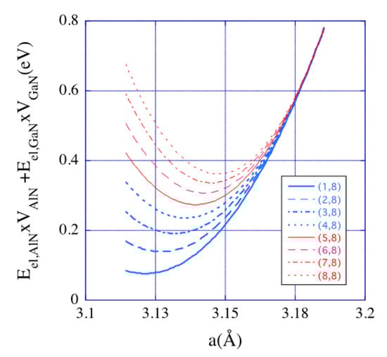 The total energy calculations have shown that withholding the condition, , the tangential deformations, e//, are functions of the QW thickness. Using the ab-initio values of the elastic moduli obtained by thermo_pw (Table A2), the elastic energy of the mechanical mixture of the two compounds is computed as a function of the common a-lattice parameter fixed by the pseudomorphic and the minimum elastic energy conditions. Figure 8 represents the results obtained for the different superlattices investigated in this work (m = 1–8, n = 8) as functions of the common a-lattice parameter by using the experimental elastic moduli [,] and equilibrium single crystal lattice parameters [,]. The minima of the plots identify the equilibrium a-lattice parameter of the superlattices, whereas the corresponding c-lattice parameters can be derived via the zero-stress elastic condition.