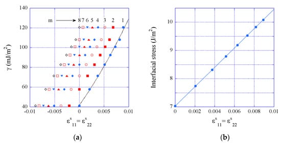 where the common lattice parameter ac (m) serves as the reference and . Equation (5) holds because the differences, between neighboring states are small (Table A3). The obtained γ-values are displayed in Figure 10a as functions of , whereas numerical labels identify the thickness in c-lattice parameter units of the QW each time used as the reference state. In this figure, the full line represents a parabolic fit to the numerical data corresponding to m = 1. This functional form has been shown appropriate by recent theoretical work when the interface is tangentially deformed under the vanishing normal external stress component [,]. For the sake of clarity, parabolic fits for other m-values, i.e., other reference states, have not been represented in the figure. The fits yield the values of the sums of the interfacial stresses and of the elasticity stiffnesses, of the two dissimilar interfaces, quantities usually not provided by similar works in the literature. The latter reveals identical for all the eight reference states (m = 1–8), amounting to , whereas the former is found to increase linearly as a function of the in-plane deformation (Figure 10b). The desirable comparison of the present findings with results from the literature is not possible, for the investigated systems differ from ours. However, the magnitudes of interfacial stress and elastic stiffness comply with these reported in the literature for a tilt grain boundary in copper [,]. Unlike other works, the properties of the two dissimilar interfaces present in the studied superlattices are not individually addressable. However, γ-values displayed in Figure 10a are remarkably lower than the experimental value of surface energy in AlN [] and calculated values for AlN [] and GaN [,,], which complies with the experimentally known mechanical stability of such interfaces against decohesion.
